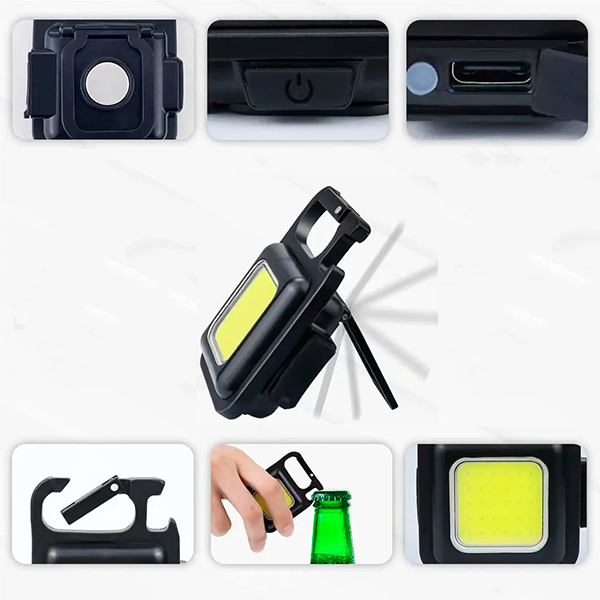 - Працює в чотирьох режимах від COB LED-обладнання — яскраве світло, приглушене світло, стробоскоп і тривале натискання кнопки живлення впродовж 2-3 секунд до максимальної яскравості.